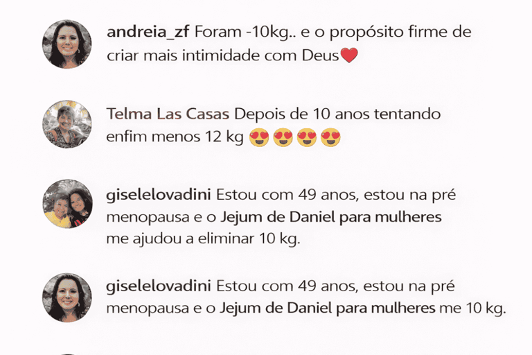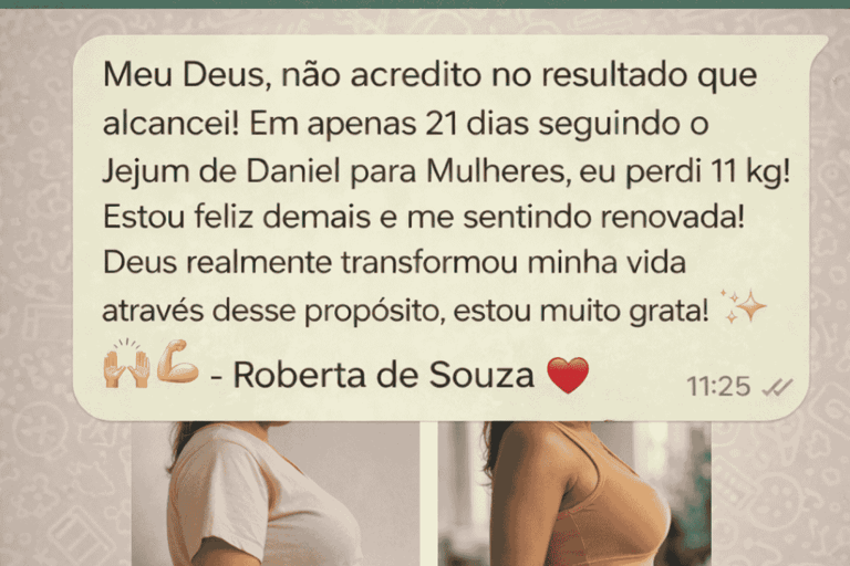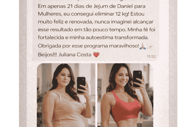 Hoje, esse princípio é adaptado para mulheres que desejam unir fé, equilíbrio emocional e cuidado com o corpo. É um jejum leve, seguro, baseado em alimentos naturais, devocionais diários e propósito, transformando não apenas a aparência,